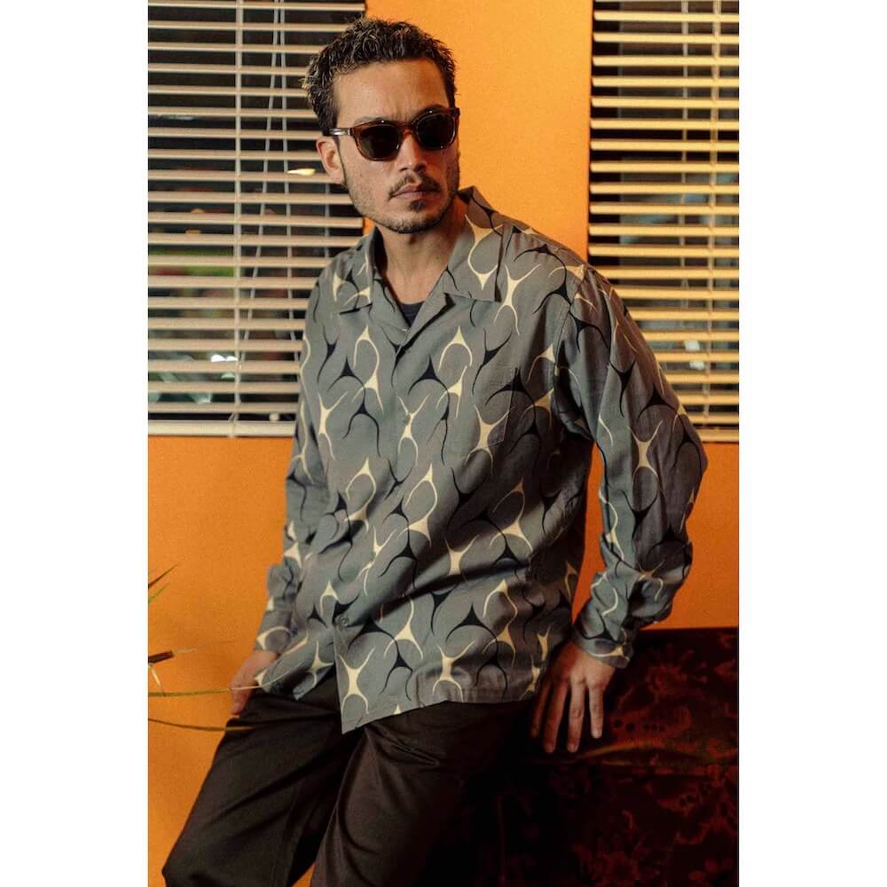 AT DIRTYオリジナルの“フレイムス”パターンを総柄に落とし込んだ一 枚。モーターカルチャーと、どこかヴィンテージ感を纏う、まさに “AT DIRTYらしいアイテム。肌あたりが柔らかく、着心地も軽やかな コットンレーヨン生地を採用。
