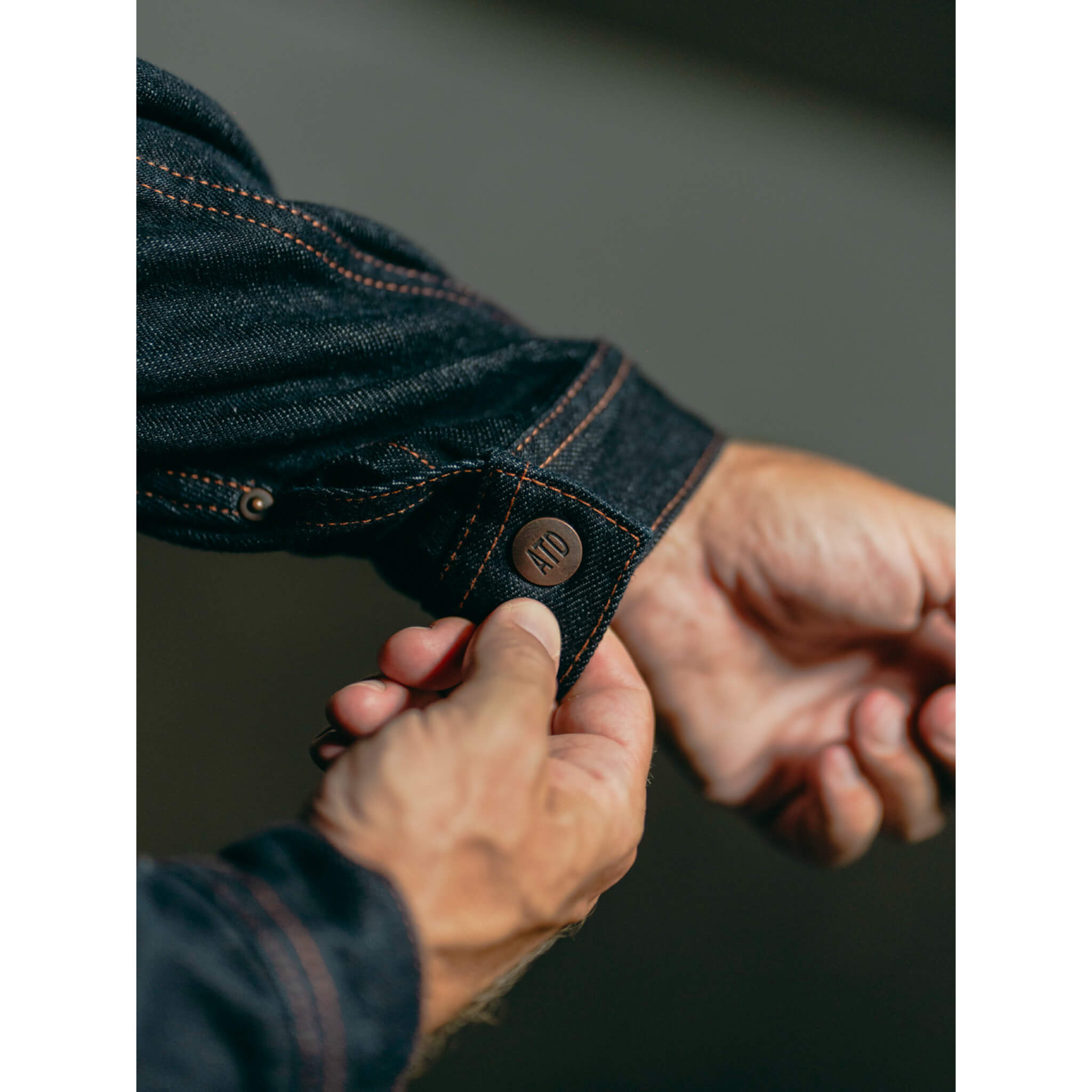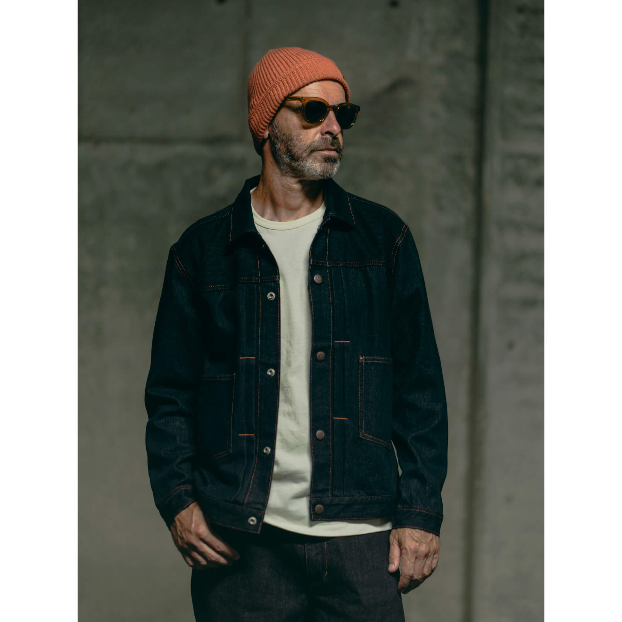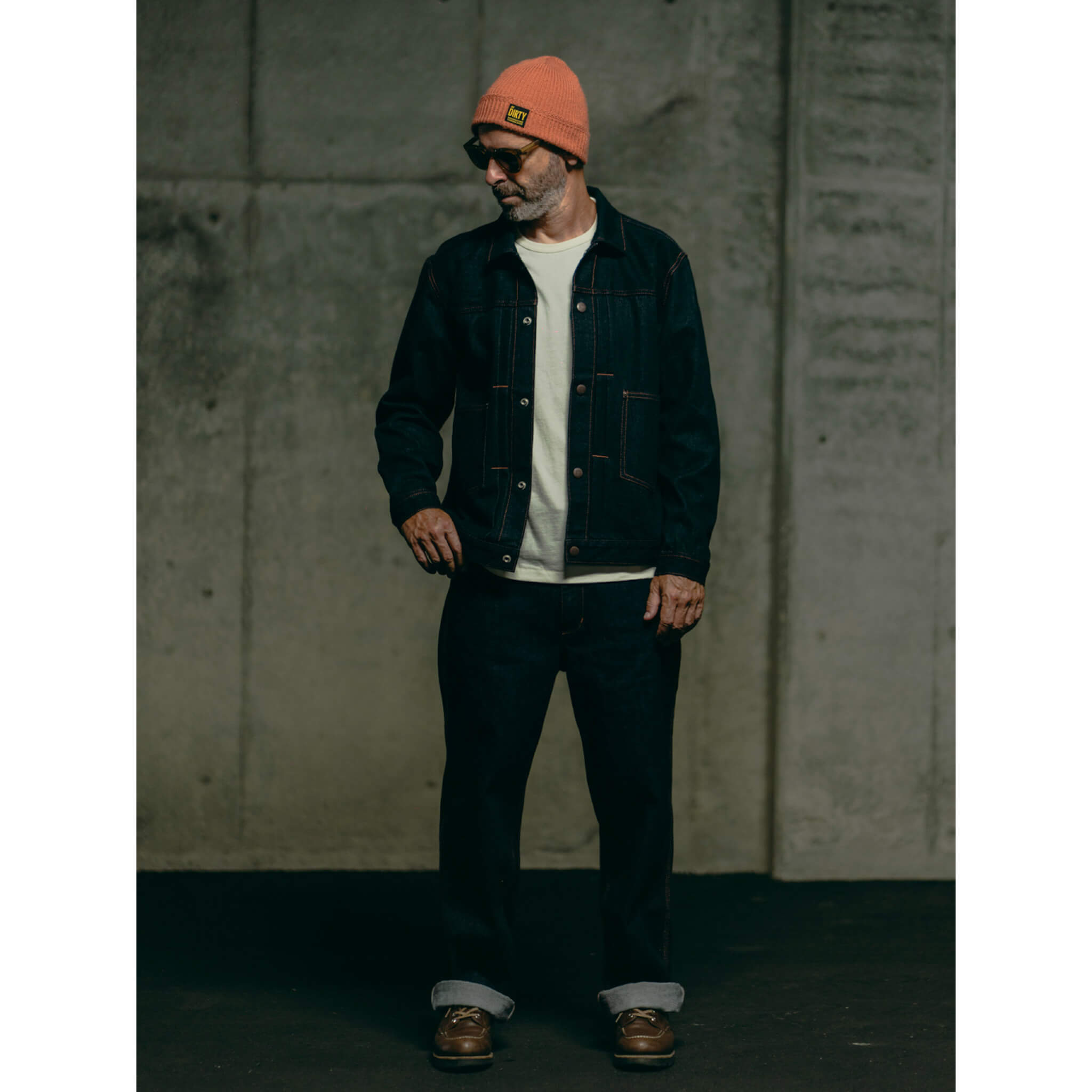 1950年代のストアブランドをデザインソースに製作。フロントのATDスナップボタン、プリーツ留め、UFOリベット等、古き良きクラシックスタイルのデニムジャケット。(オリジナルスナップボタン使用)