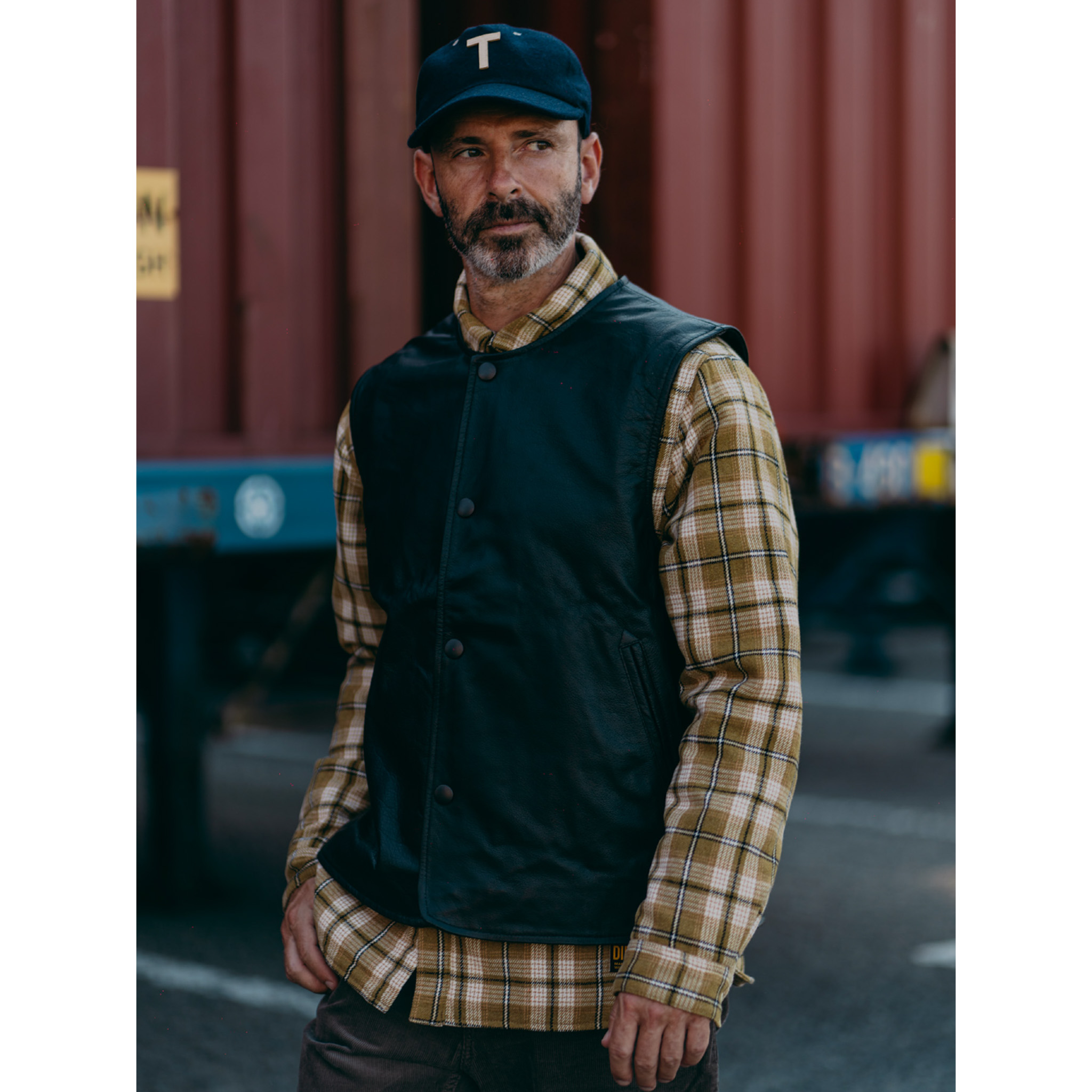 クラシックなジャーキンベストをベースに、耐久性に優れたカウレザーを使用してアップデート。オリジナルにはなかったサイドポケットを加え、日常での実用性を高めた。現代のシルエットに合わせたオリジナルパターンで着心地の良さと動きやすさを両立させた一着。