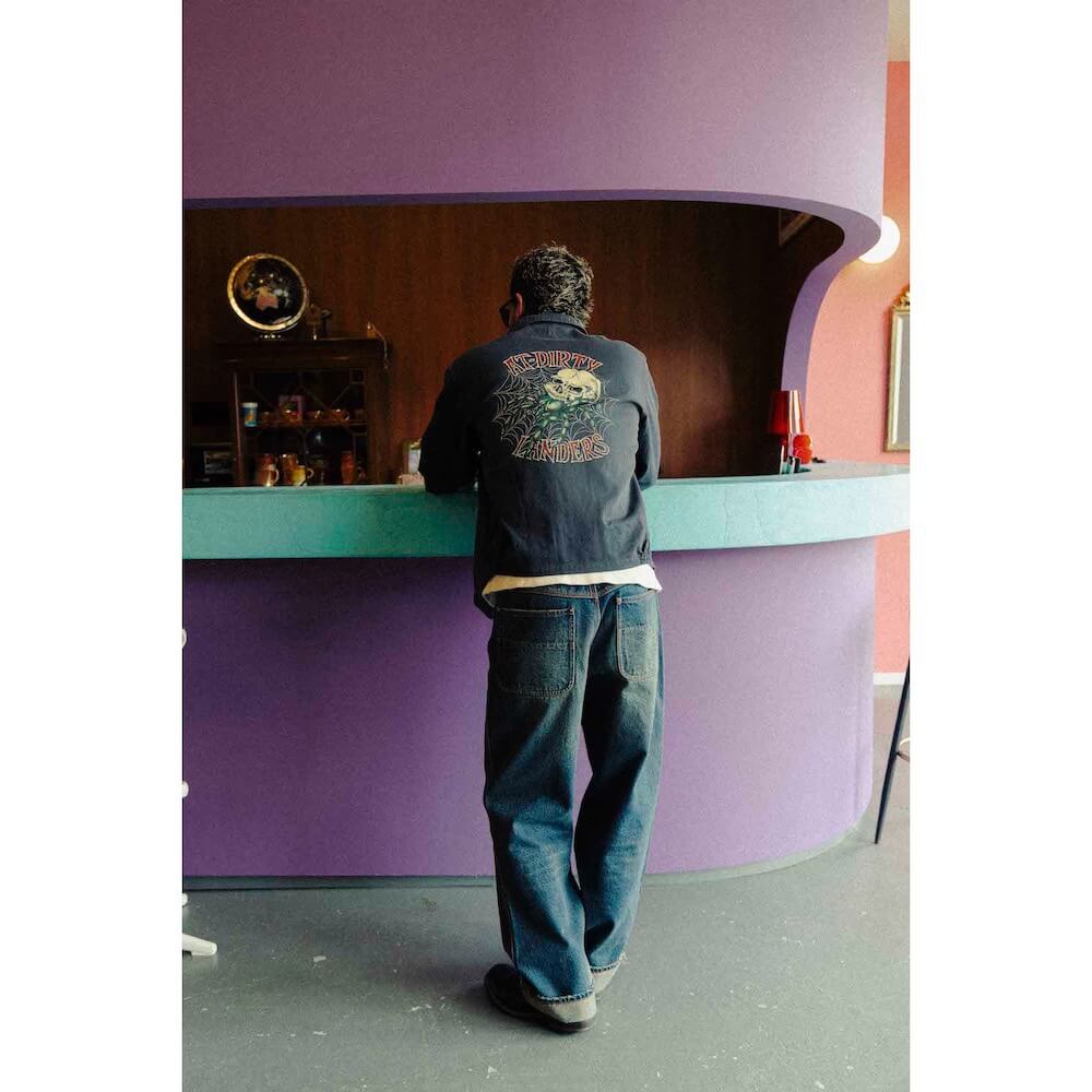 1980年代のサブカルチャーアートから着想を得た、スカルスパイダーのバックプリントが印象的な一枚。デザインを手がけたのは、親交深いロサンゼルスに拠点を置くアパレルショップ〈LANDERS〉の Chloe。胸元にはDirtyのチェーン刺繍。