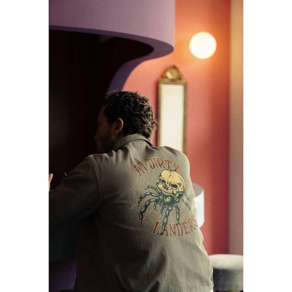 1980年代のサブカルチャーアートから着想を得た、スカルスパイダーのバックプリントが印象的な一枚。デザインを手がけたのは、親交深いロサンゼルスに拠点を置くアパレルショップ〈LANDERS〉の Chloe。胸元にはDirtyのチェーン刺繍。