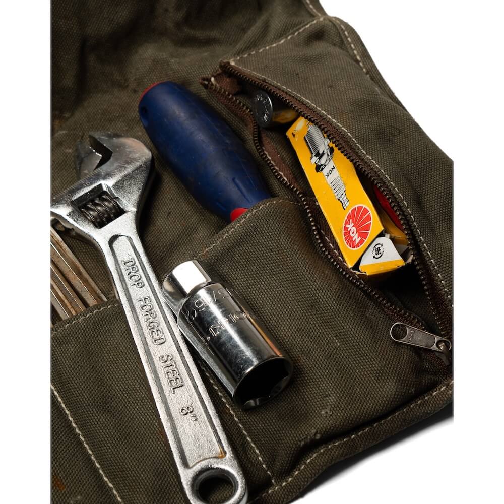 AT-DIRTYのプロダクトとCREEK motorcycleの思考より製作されたツールバッグ。