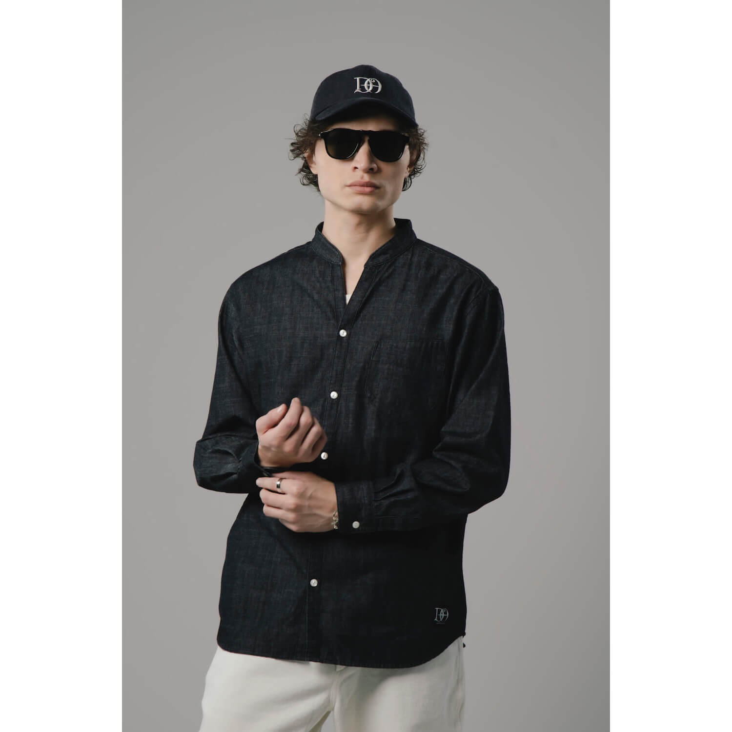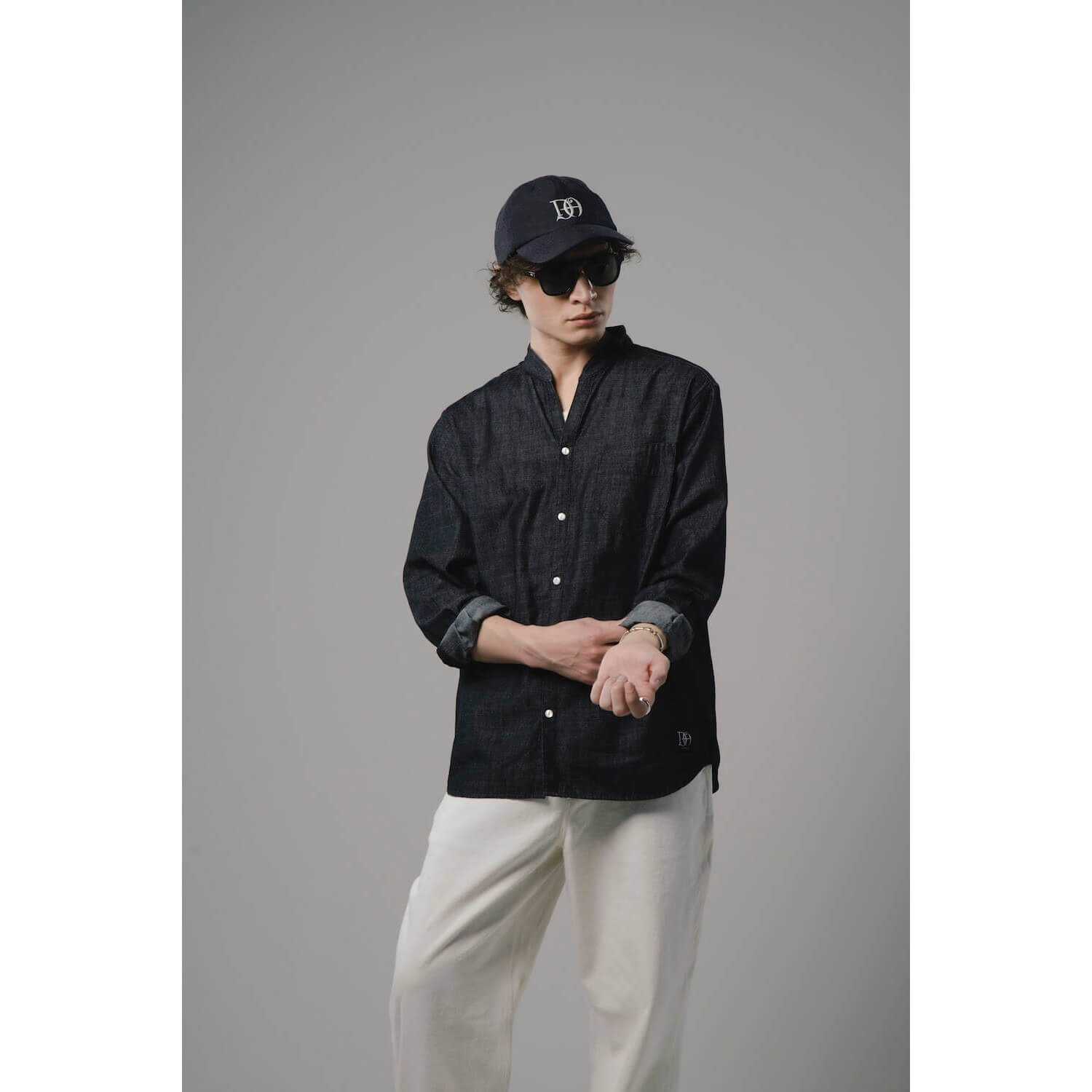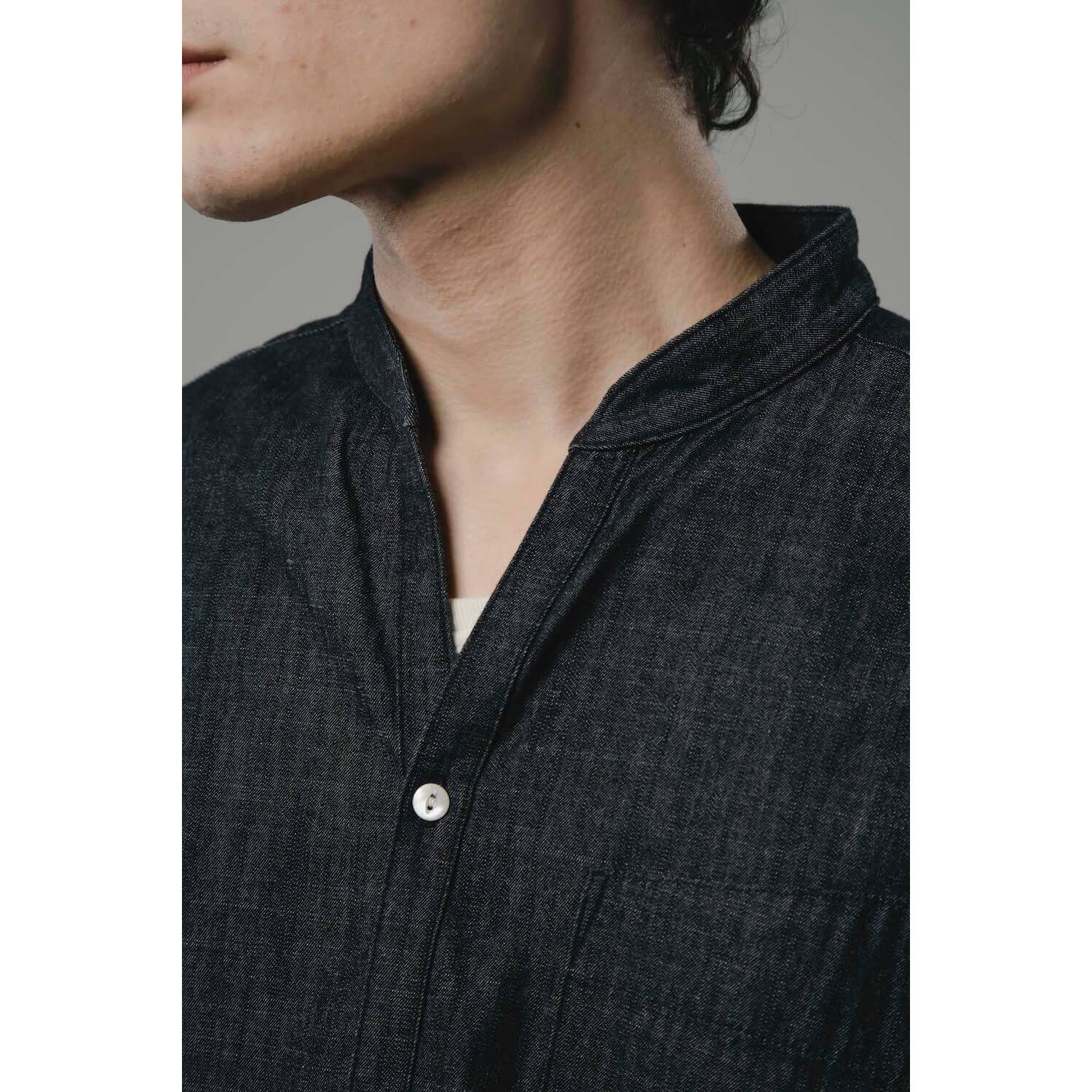 柔らかで洗いざらした質感のシャンブレー生地を使用したスキッパーシャツ。首元をすっきりと見せるスタンドカラーと胸元に抜け感をもたらすスキッパーデザインを融合したオリジナルパターン。素材ならではの経年変化も楽しめる。