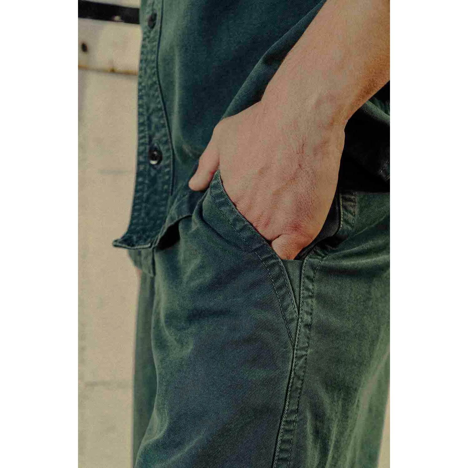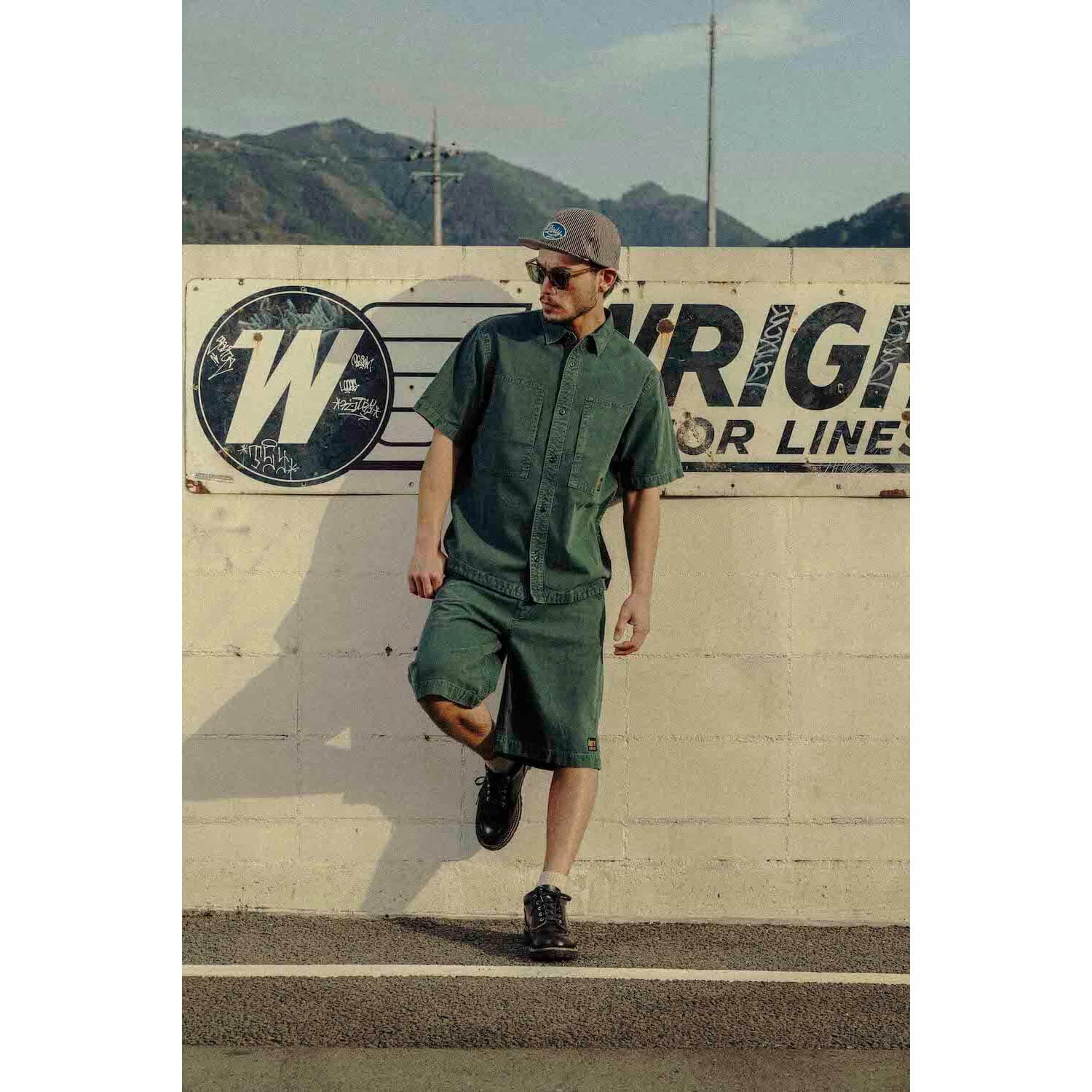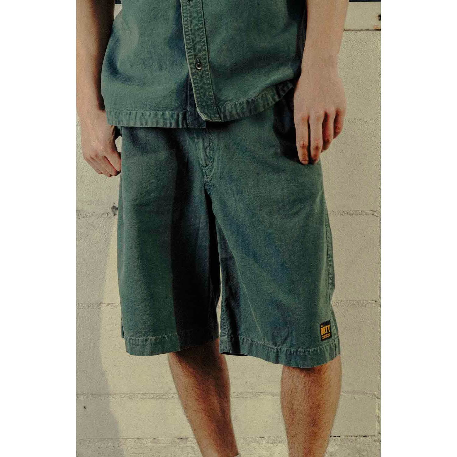 オーバーダイ加工とストーンウォッシュにより、ヴィンテージライクな風合いに仕上げたワークショーツ。程よい厚みのある生地は、見た目にしっかりとした存在感を与えながらも、コットンとレーヨンの混紡素材を使用し強度としなやかさを合わせ持つ。