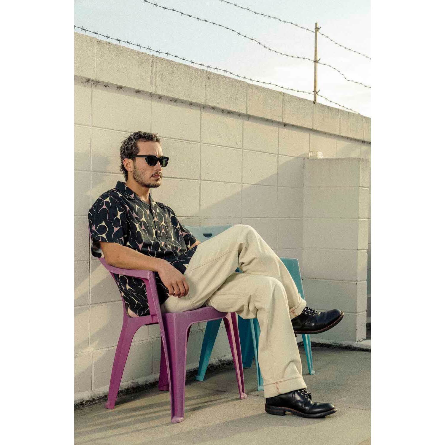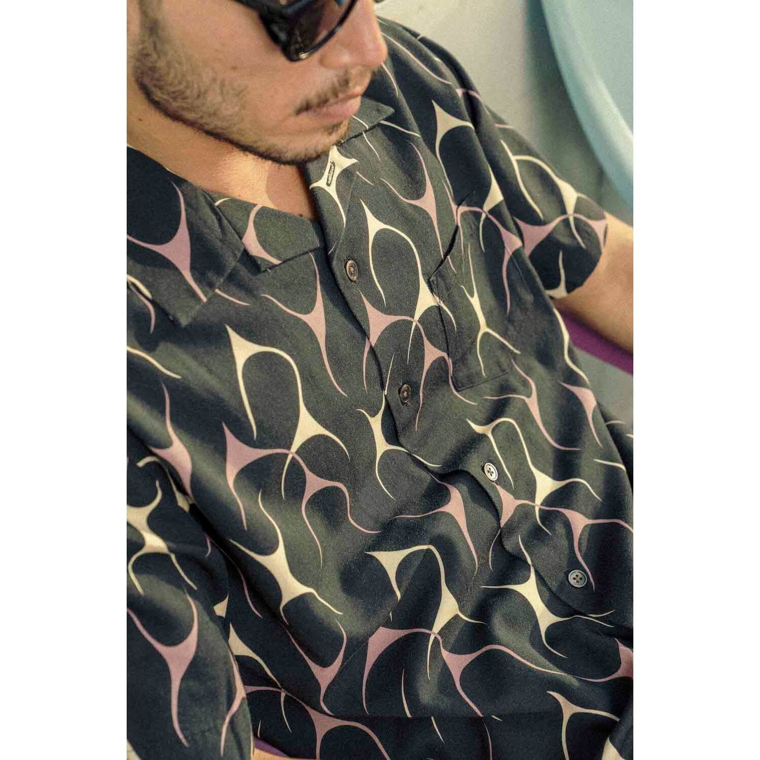 AT DIRTYオリジナルの“フレイムス”パターンを総柄に落とし込んだ一枚。モーターカルチャーと、どこかヴィンテージ感を纏う、まさにAT DIRTYらしいアイテム。肌あたりが柔らかく、着心地も軽やかなコットンレーヨン生地を採用。